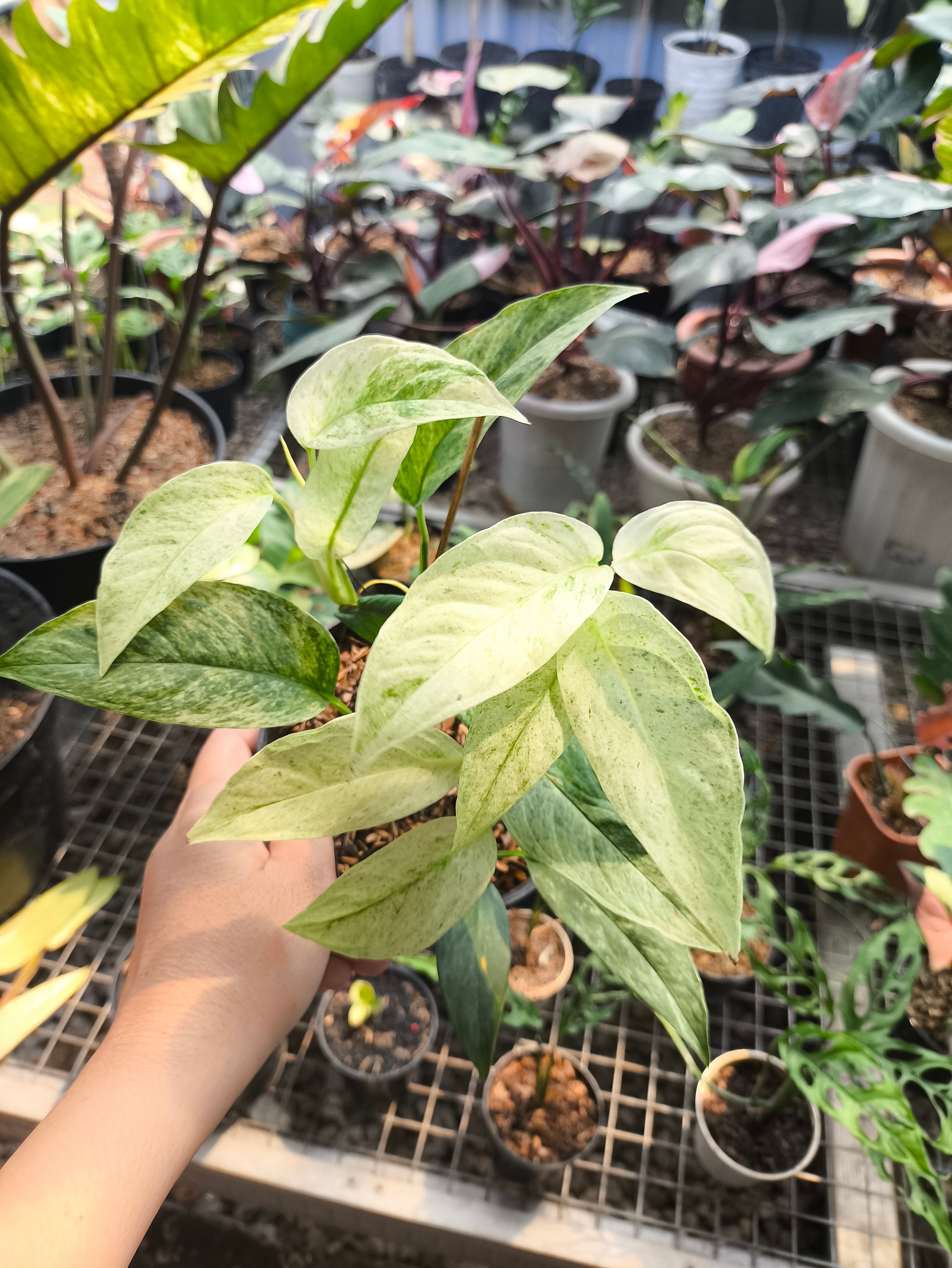 Monstera Albo Variegata is a highly sought-after tropical houseplant prized for its striking white and green variegated foliage. Each leaf displays unique patterns of creamy white sections against deep green, creating a visually dramatic display. This climbing aroid thrives indoors with bright, indirect light and moderate watering, making it an excellent choice for experienced plant collectors. Its aerial roots naturally develop as it matures, allowing it to climb moss poles or trellises. Relatively low-maintenance once established, this variegated variety adds sophisticated botanical interest to any interior space while improving air quality.